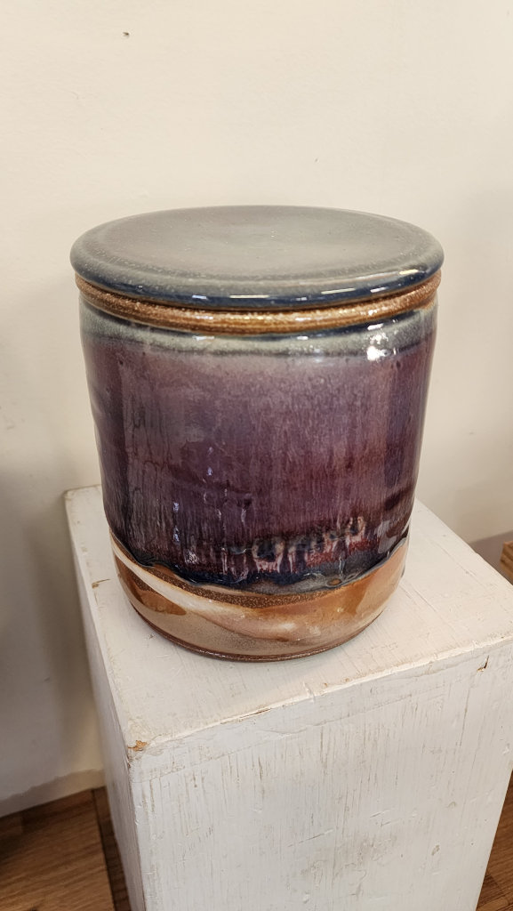 Carved lid and gallery for a snug fit; liner glaze inside for dry goods or coffee.